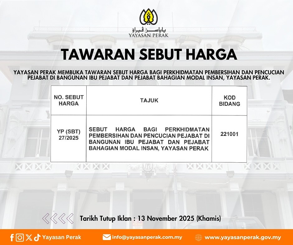 Yayasan Perak mempelawa syarikat-syarikat yang berkelayakan dan berdaftar dengan Kementerian Kewangan Malaysia dan bertaraf Bumiputera dalam bidang berkaitan untuk menyertai sebut harga seperti berikut: